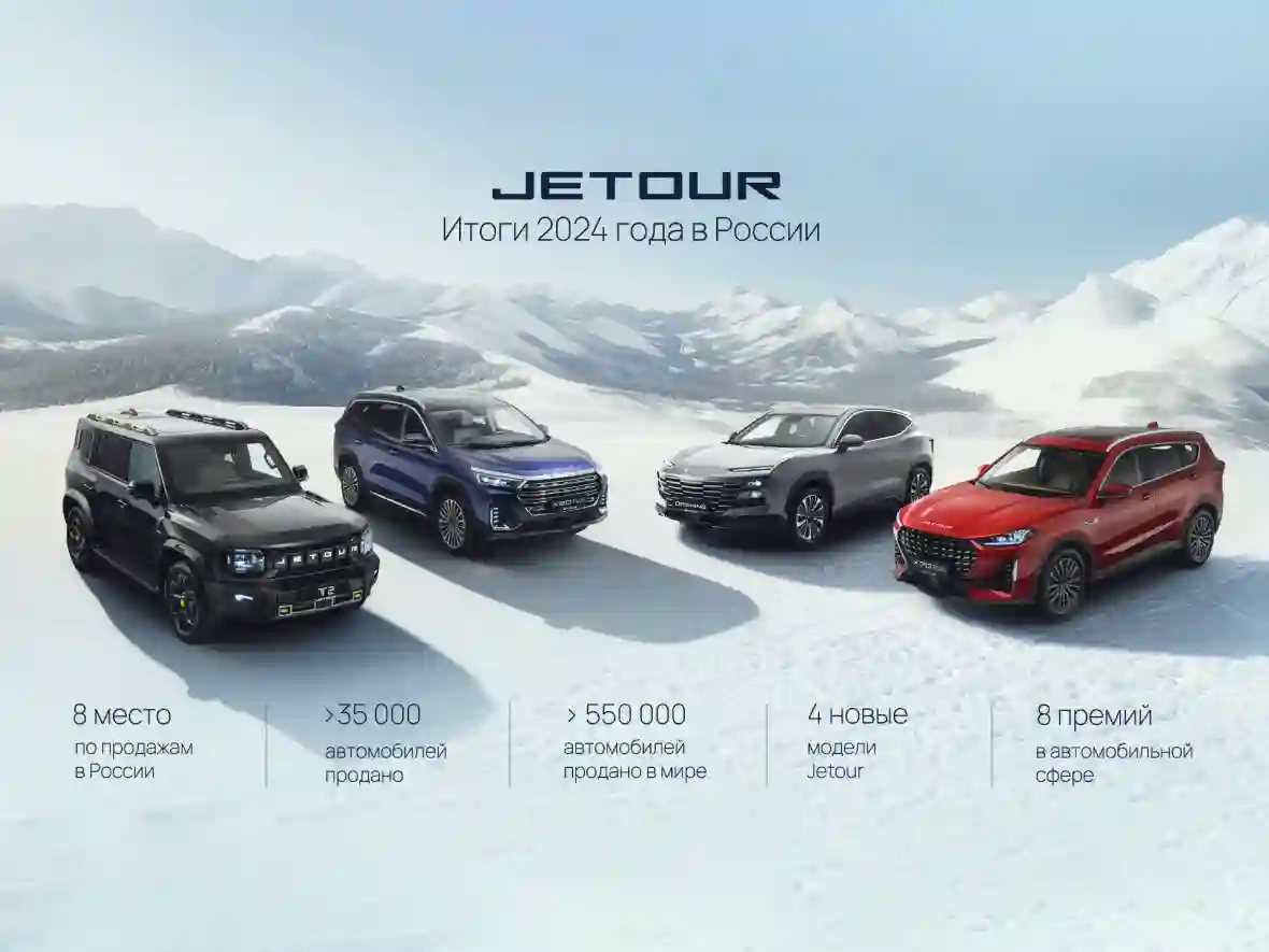 Jetour подвел итоги своей работы в 2024 году в России и на глобальном рынке. За это время на российском рынке бренд представил 4 новых модели и укрепил позиции в рейтинге самых востребованных автомобильных брендов в РФ. Суммарно по итогам года Jetour уверенно занял восьмое место по объему продаж на рынке. Всего в 2024 году в России было продано более 35 000 новых автомобилей Jetour. Доля бренда на российском автомобильном рынке составила 2,23%.